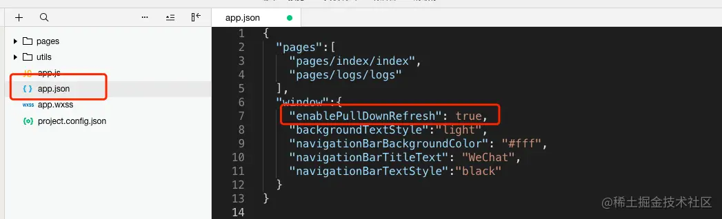 - 1.如果需要整个项目都开启【下拉刷新】和【上拉加载更多】,在只需要在app.json文件里面,找到windows的节点。猛敲你的键盘!!