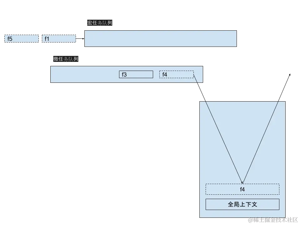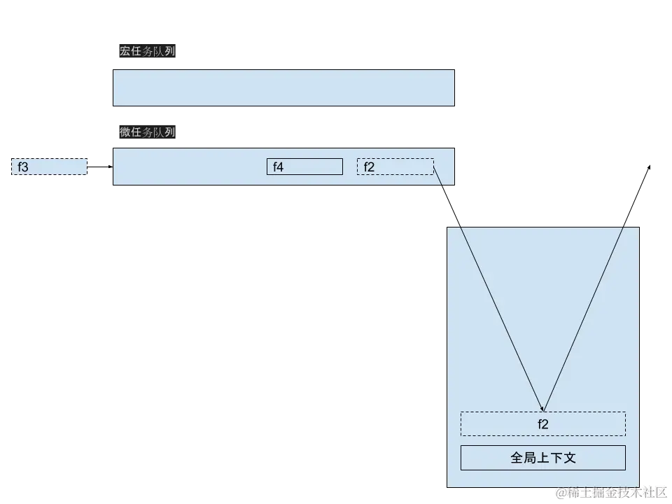 微任务队列不为空,推出 f2 放入调用栈,执行 f2 后调用栈弹出 f2,注意:执行完 f2 后,f3 又被放入微任务队列。打印 f2。