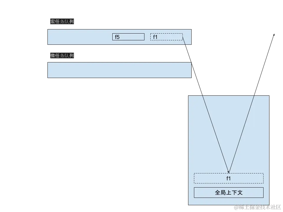 宏任务队列不为空,推出 f5 放入调用栈,执行 f5 后调用栈弹出 f5。打印 f5。
