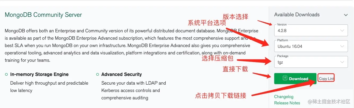 ``` # 下载到服务器 # 注意要选择 与 你自己的服务器版本符合的对应的mongoDB的版本下载 wget https://fastdl.mongodb.org/linux/mongodb-linux-x86_64-ubuntu1604-4.2.8.tgz # 解压 tar -zxvf mongodb-linux-x86_64-ubuntu1604-4.2.8.tgz ```-