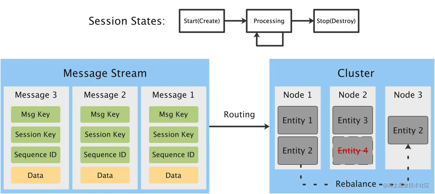 核心问题只有一个: 确保 Session 中的消息被正确投递到对应的 Entity 中 。看似简单,但 Entity 的载体是 Nodes ,Nodes 受各种条件影响变化几乎是不可避免的。难点就转换为:怎么保证 Entity 的逻辑地址和物理地址(所属 Node 地址)解耦,不变的逻辑地址如何自动化更新对应的物理地址。