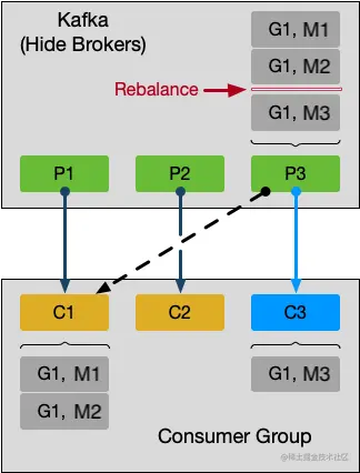 如图所示,Partition 3 本来由 Consumer 1 消费。Game 1 中的事件按先后顺序分别是 M1,M2,M3。当 M1 和 M2 被 C1 消费后,Consumer 3 加入成功,Partition 3 被分配给 C3。那么 Game 1 中的 M3 则转由 C3 处理。显然 G1 数据被截断分拆给不同的 Consumer 处理,结果是不正确的。