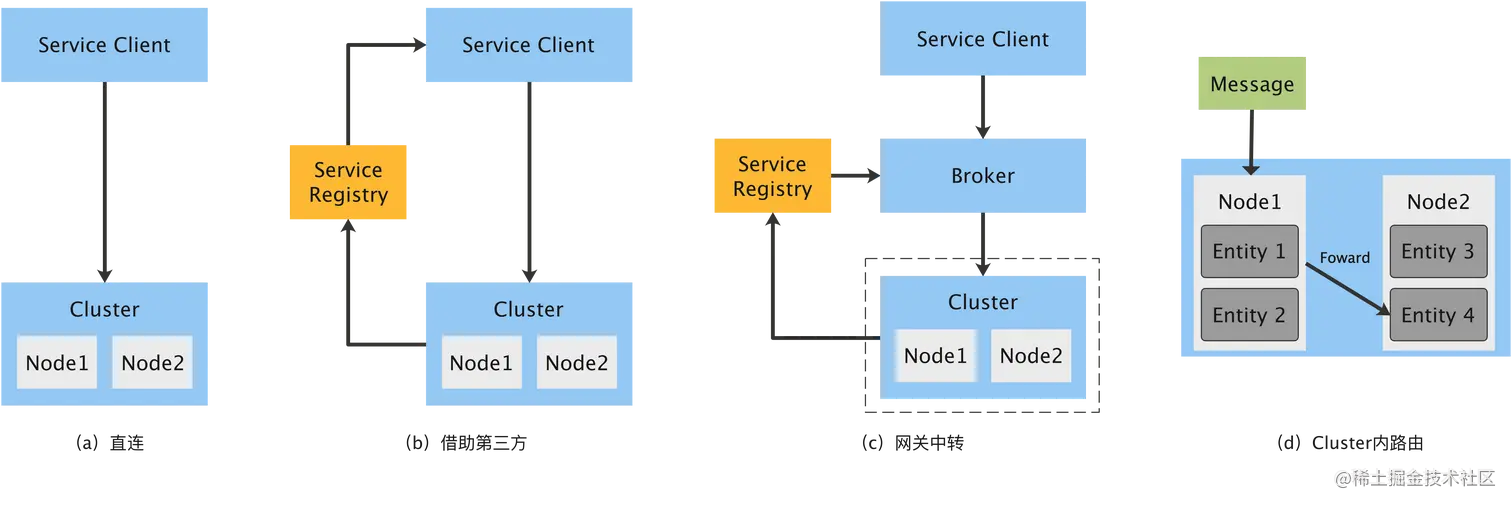- (d) Cluster 内路由: 将复杂的路由隐藏到 Cluster 内部,内部节点承担数据转发功能。相比网关中转优势在于:外部只需要考虑负载均衡,不必担心路由;最差情况才会多一次 hop 。