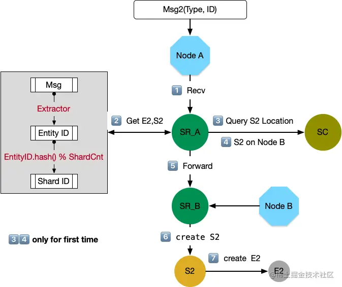 上述过程描述了,Node 收到消息并在本地创建 Shard 和 Entity 的过程;如果已经创建好,那么本地路由就不必再和 SC 交互,直接转发给本地 Shard 即可,因为 SR 保留了本地路由信息。