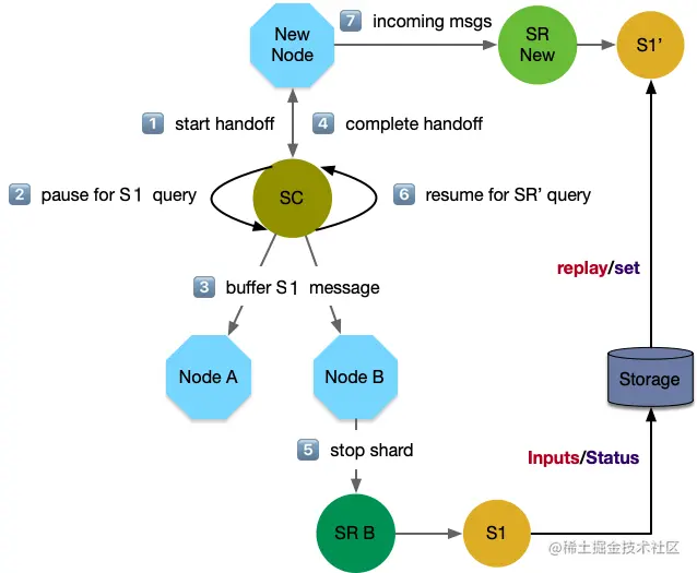 - S1 处理完所有消息后,告知 SC 自己已经没有遗留工作,可以关闭。对于有状态的 shard,还需要完成状态到 S1' 的同步。之后 SC 认为迁移流程结束。