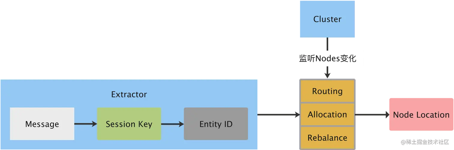 而 Session 消息到 Entity 的稳定路由则全部由 Cluster 内部的 Sharding 机制解决。