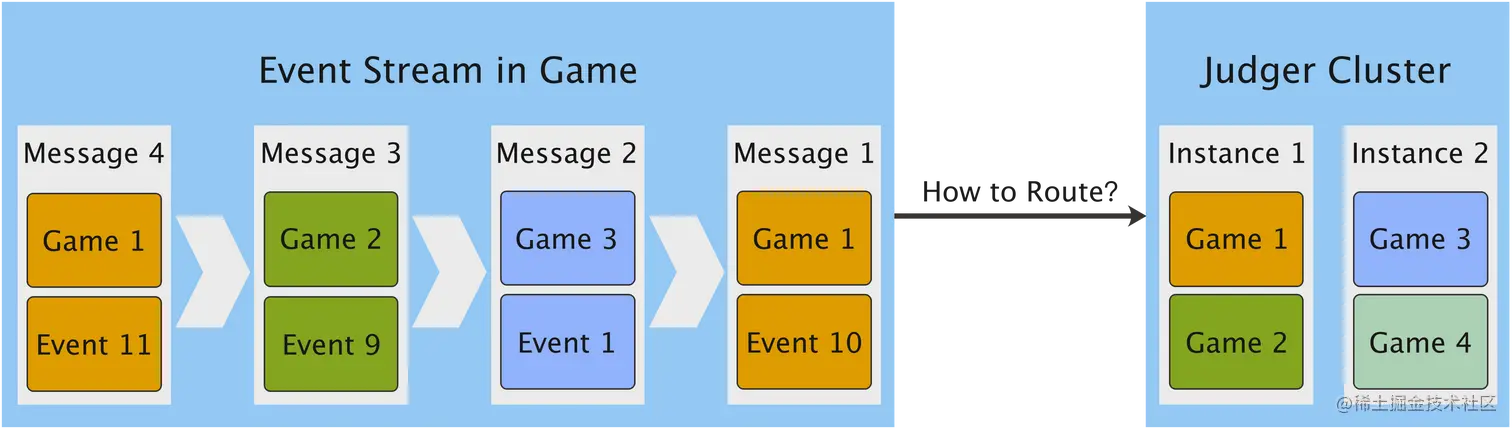 Judge Cluster 是消极比赛裁决服务集群,包含多个进程实例(Instance)。每个 Instance 上运行多个裁决器,裁决器和具体单局 Game i 一一对应。 Game i, Event j 表示单局 i 中的第 j 条事件。消极判定依赖事件上下文,所以单局事件须 完整、有序 交给 同一对应裁决器 处理。因为判定逻辑依赖行为的因果关系,因果关系既和 Event Time 顺序有关,也和事件完整性有关。比如角色在战斗过程中死亡,是正常行为;但如果站着不动让别人攻击,那就有消极嫌疑。这种场景对架构设计提出以下要求: