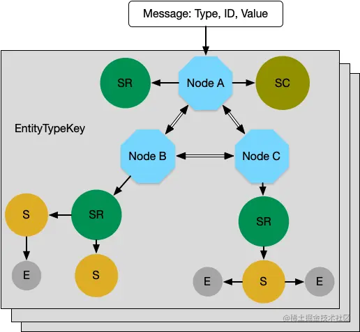 - Entity 和 Node 的映射关系可能动态调整,比如 Cluster 扩缩容,Node 消息不可达或响应过慢导致的 Entity 在 Nodes 上分配的重新调整(Rebalance)。