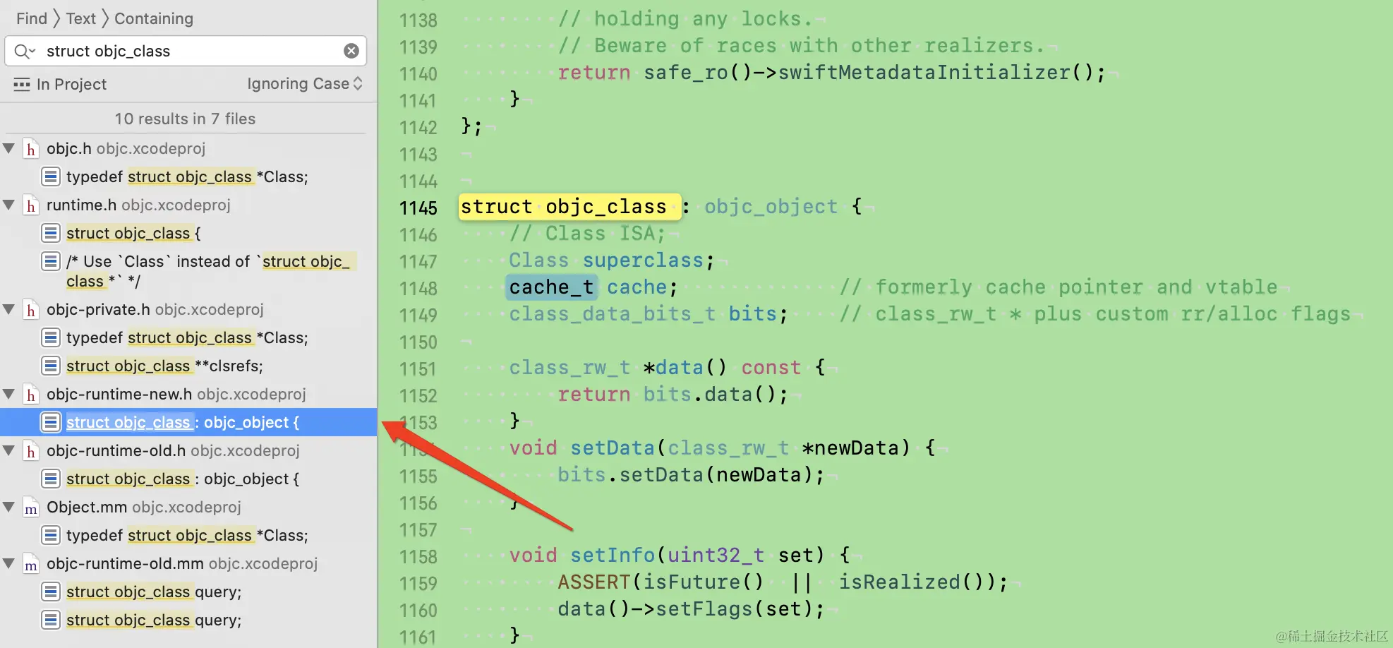 在这篇文章中我们说道Class在底层是一个objc_class那么它到底是如何实现的呢?我们来到objc源码中一探究竟。我们知道objc_class是一个结构体我们搜索struct objc_class,我们发现会有很多结果,那么我们到底去分析那个版本呢,我们应该知道runtime有old和new两个版本,那么新版本当然作为我们的首选,所有我们打开objc-runtime-new.h进行一探究竟。