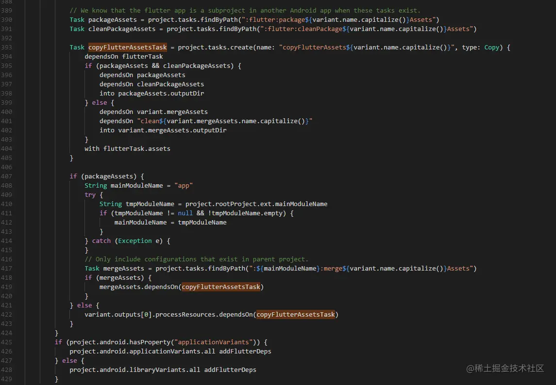 配置完了打包安装运行还是包上面的错误。根据上面文章,找到 flutter 安装目录下的打包使用的 gradle,flutter/packages/flutter_tools/gradle/flutter.gradle 文件,其中有这么个方法