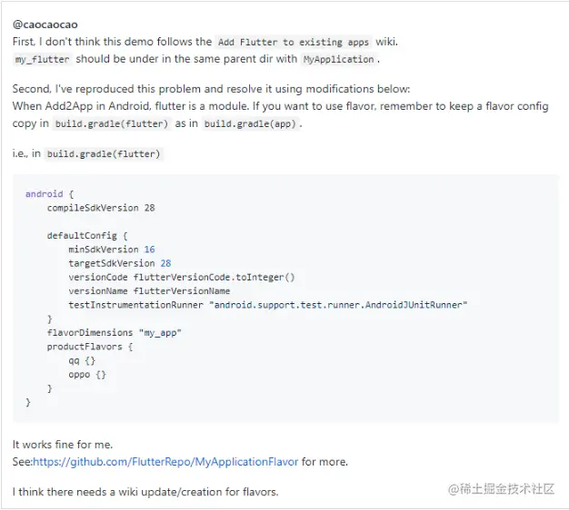 关于上面的多渠道打包的问题,有人说 flutter module 中的.android 文件夹是 flutter 自己生成的,提交代码的时候并不会提交这个文件夹下的任何内容。我们可以魔改一下上面提到的 flutter.gradle 文件,在打多渠道包的时候将当前的渠道信息传进去,在 gradle 文件中读取一下渠道信息就好。