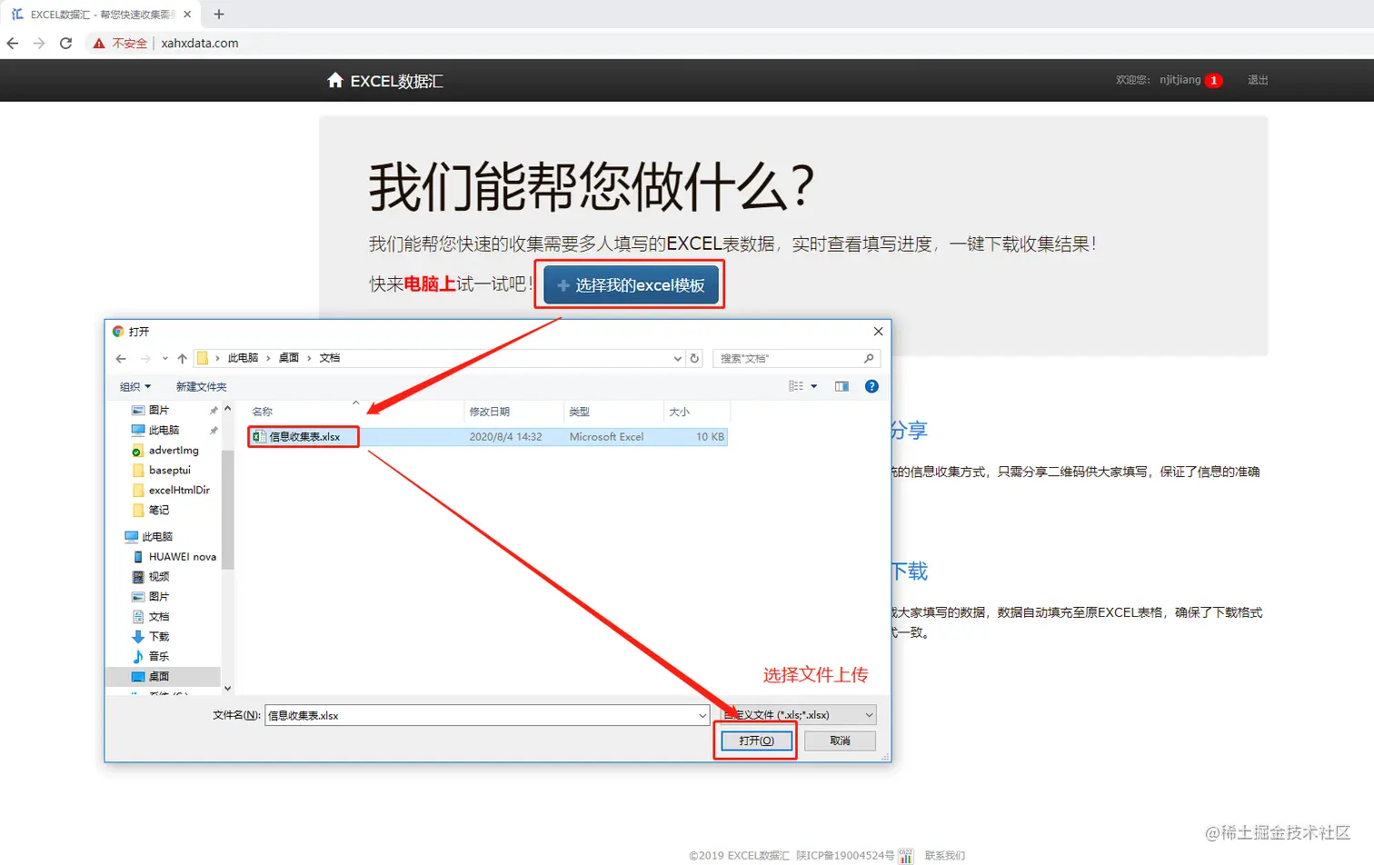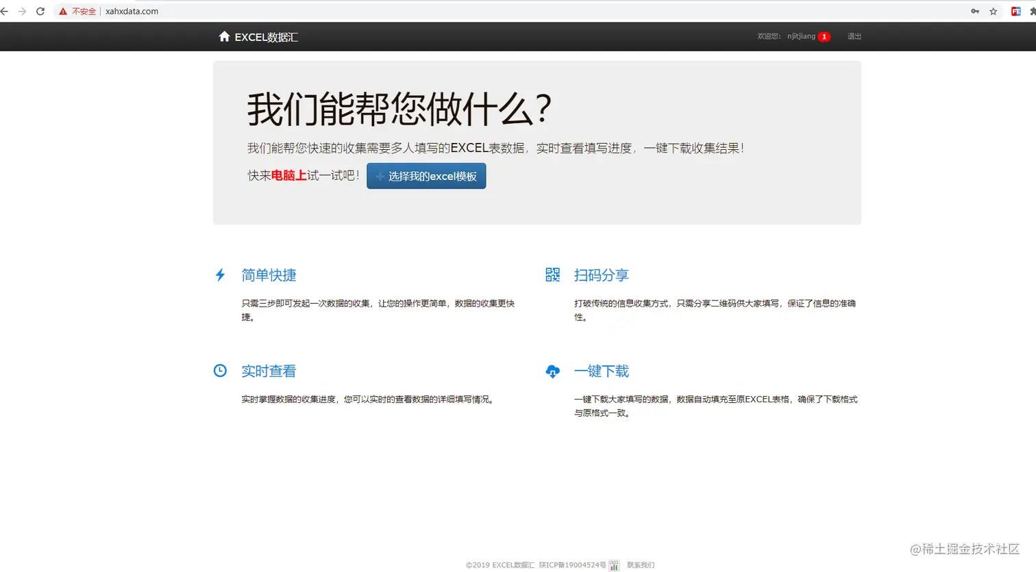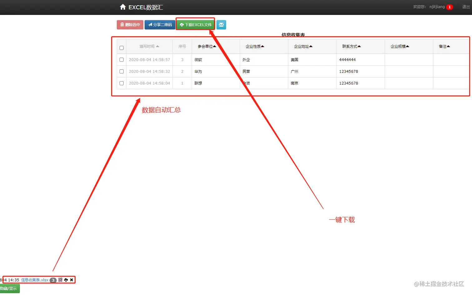 8、信息收集人可以直接在电脑端浏览自己采集的数据,数据将会自动进行汇总展现给采集人,然后采集人可以点击【下载EXCEL文件】按钮,将采集到的数据进行下载,下载的数据就是一个和模板一致的并且进行了整合的一个电子表格,此时不需要采集人再费力气去整合