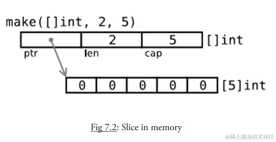 在第二幅图中, p := make([]int, 0) ,切片 已经被初始化,但是指向一个空的数组。