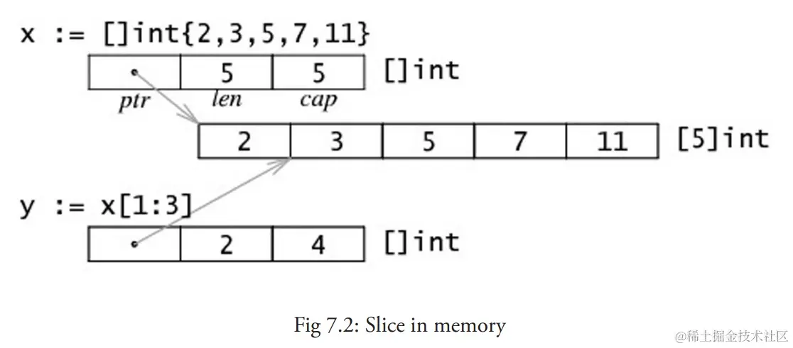 切片在内存中的组织方式实际上是一个有 3 个域的结构体:指向相关数组的指针,切片长度以及切片容量。下图给出了一个长度为 2,容量为 4 的切片y。
