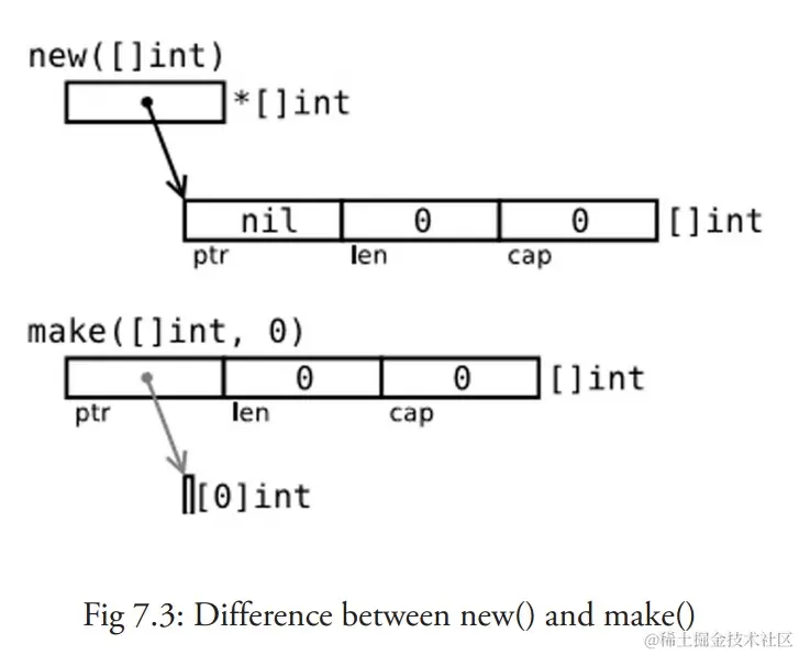换言之,new 函数分配内存,make 函数初始化;下图给出了区别: