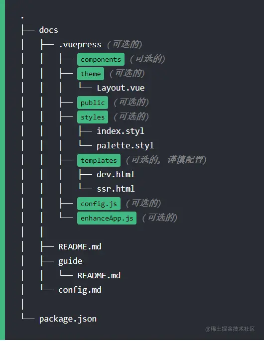 - docs/.vuepress: 用于存放全局的配置、组件、静态资源等。