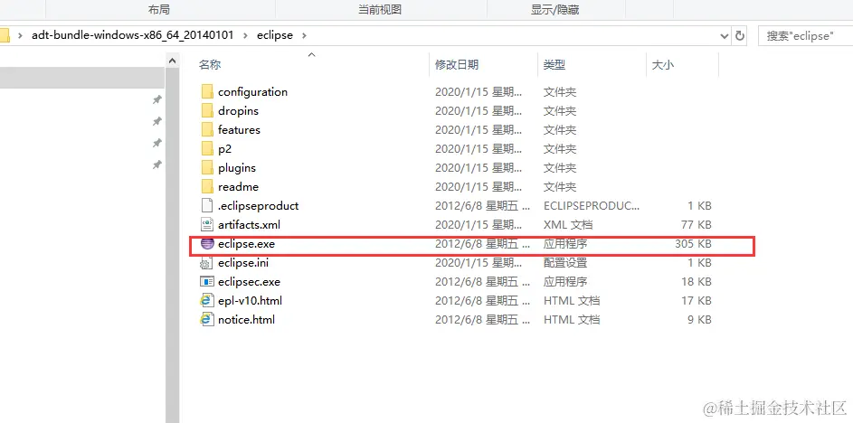 打开之后会看到很多文件及文件夹,直接双击倒数第五个eclipse.exe文件,打开eclipse工具,如图4.2所示。