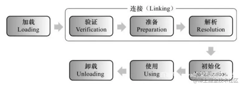 类是有生命周期的,类在JVM中的生命周期由加载开始,卸载结束。