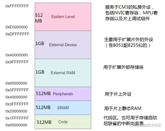 Cortex-M3支持4GB的存储空间,它的存储系统采用统一编址的方式; 程序存储器、数据存储器、寄存器被组织在4GB的线性地址空间内,以小端格式(little-endian)存放。由于Cortex-M3是32位的内核,因此其PC指针可以指向2^32=4G的地址空间,也就是0x0000_0000——0xFFFF_FFFF这一大块空间。见下图: