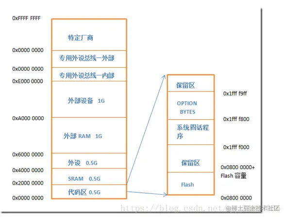 ST大叔根据ARM老爸的图纸,把自己的内存按照一定的尺寸映射了进去。主要说明SRAM和FLASH的映射地址。
