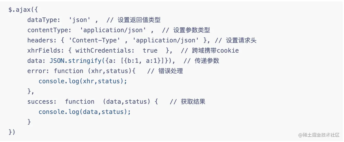 $.ajax({ dataType: 'json', // 设置返回值类型 contentType: 'application/json', // 设置参数类型 headers: {'Content-Type','application/json'},// 设置请求头 xhrFields: { withCredentials: true }, // 跨域携带cookie data: JSON.stringify({a: [{b:1, a:1}]}), // 传递参数 error:function(xhr,status){ // 错误处理 console.log(xhr,status); }, success: function (data,status) { // 获取结果 console.log(data,status); }})