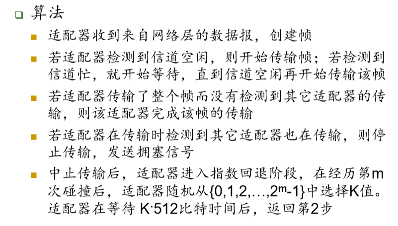 使用CSMA/CD:载波侦听,碰撞检测,随机回退