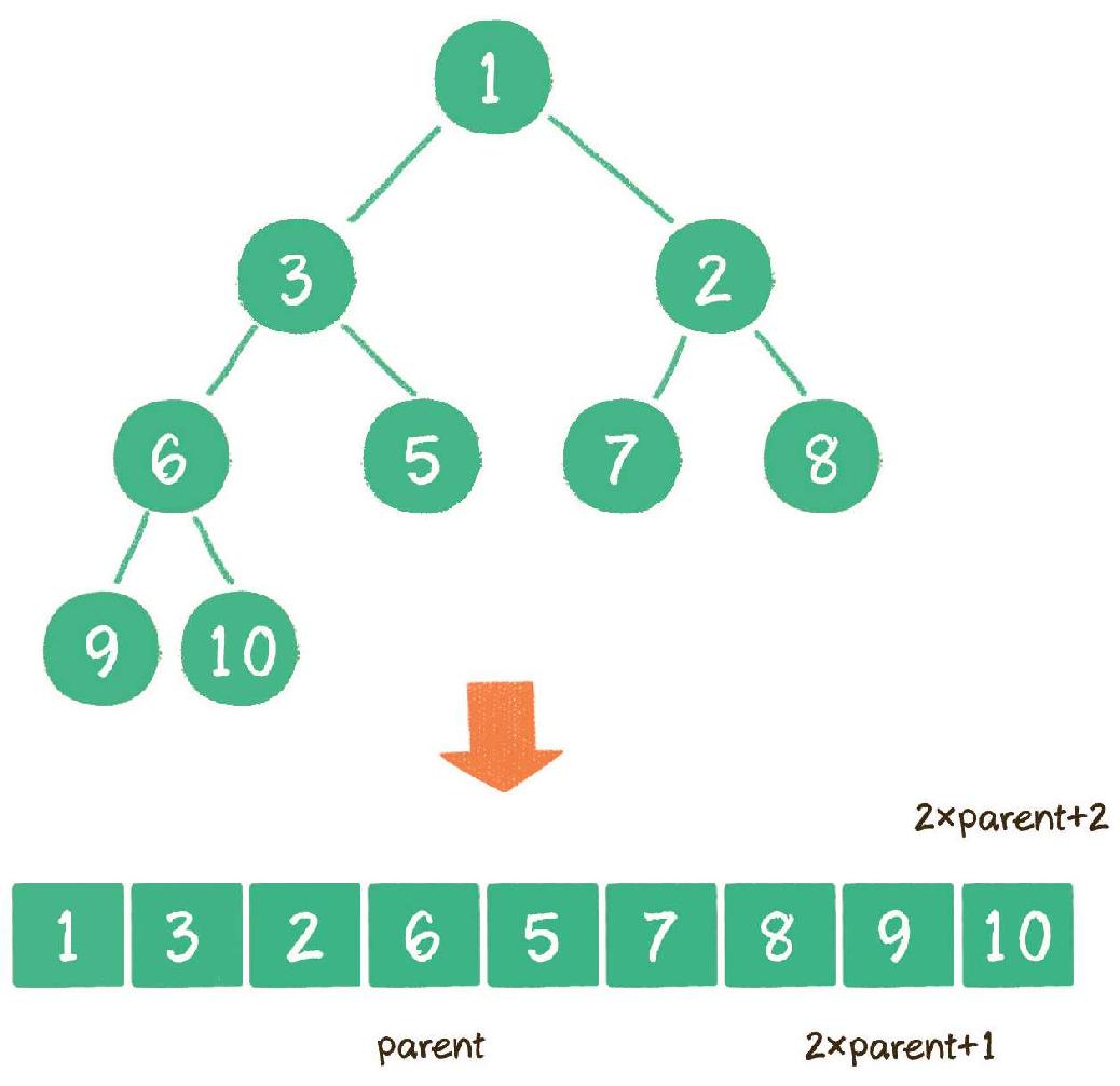 - 在最小堆中,任何一个父节点的值,都小于或等于它左、右孩子节点的值。