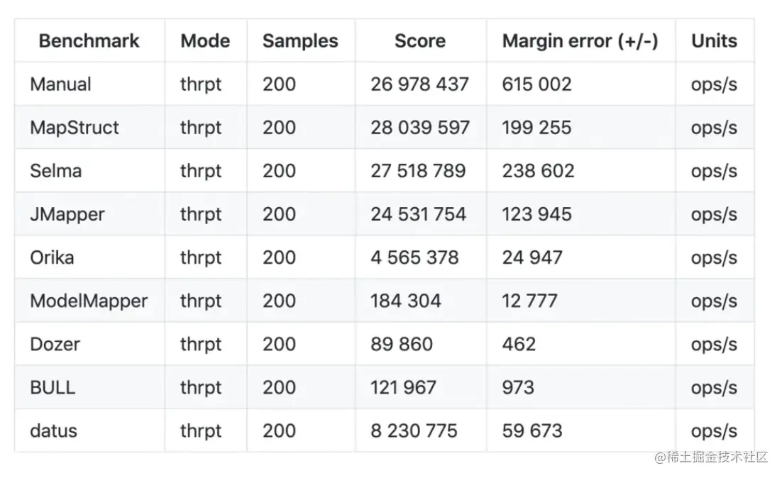 以上介绍的数据转换都是BeanCopy框架中的一种,BeanCopy框架一共有Dozer、BeanCopier、BeanUtils、MapStruct、ModelMapper、Selma、Orika、JMapper这几种。其原理就是下图:如果就性能来说的话,如下图所示:
