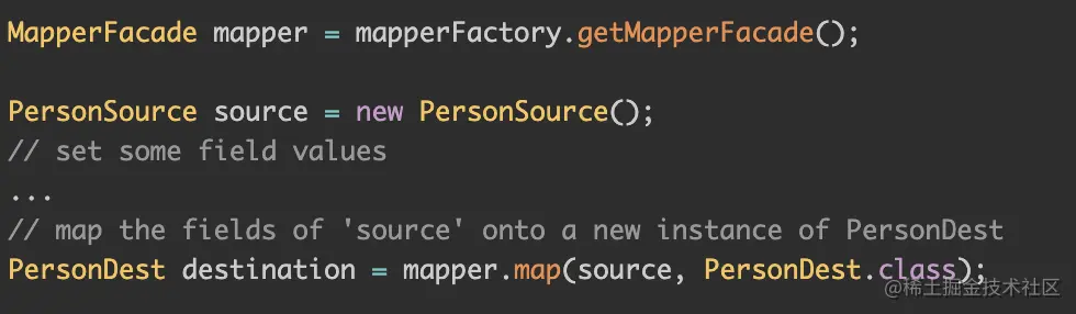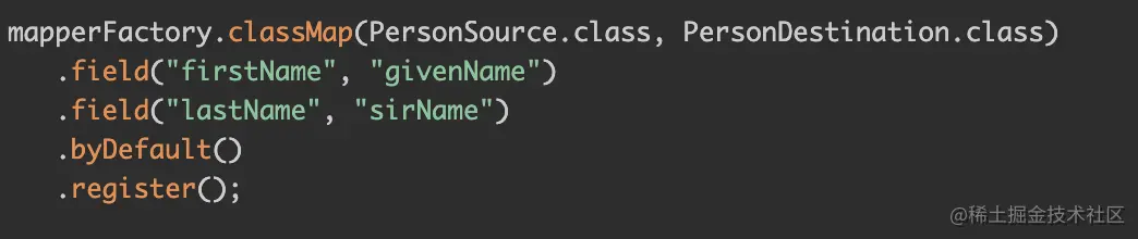 字段映射是双向的,我们可以从目标类型映射回源类型,byDefault()方法用于注册名称相同的属性(如果所有属性名称都相同则可以省略上面步骤),如果不希望某个字段参与映射,可以使用exclude方法最后就是进行映射: