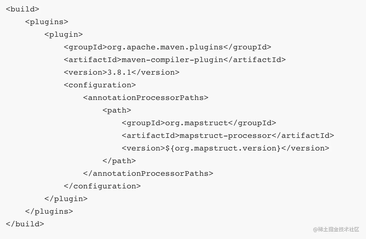 为了让上述的配置生效还要在maven-compiler-plugin插件中配置上对mapstruct-processor的引用。最后我们封装一个数据转换的映射接口,使用接口@Mapper和方法@Mappings(source = "数据1", target = "数据2")注解。同时MapStruct会对基本类型、封装类型、String类型和枚举类型之间自动做映射,不需要我们做额外配置。如果我们在转换映射过程中,想要给一些属性定义一个固定的值,这个时候可以使用@Mapping(source = "数据", constant = "具体值")。除了以上的类型,MapStruct做类型转换会使用@Mapping(target = "数据2",expression = "java(具体转换类型)"),相比较于其他几种工具,因为MapStruct在编译时生成bean映射,确保了高性能,所以当我们在做高并发、成千上百万的数据交互的时候,会优先使用MapStruct。有的人会觉得操作麻烦,每当有新的数据的时候,都要封装一个新的交互接口,开头我们说到:计算机科学领域的任何问题都可以通过增加一个间接的中间层来解决,如果不行,那就加两层。我们也可以对映射的接口抽取再封装,解决操作麻烦的问题。MapStruct的官方例子把接口定义成 EntityMapper, DtoMapper,不用每种映射都要单独定义映射接口。