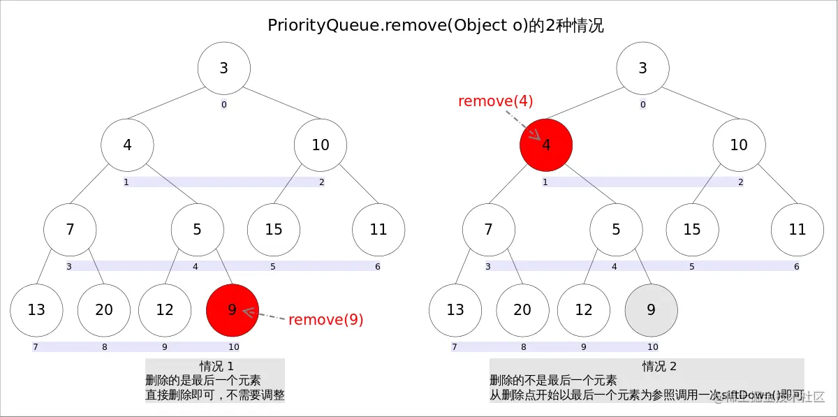 remove(Object o)方法用于删除队列中跟o相等的某一个元素(如果有多个相等,只删除一个),该方法不是_Queue_接口内的方法,而是_Collection_接口的方法。由于删除操作会改变队列结构,所以要进行调整;又由于删除元素的位置可能是任意的,所以调整过程比其它函数稍加繁琐。具体来说,remove(Object o)可以分为2种情况:1. 删除的是最后一个元素。直接删除即可,不需要调整。2. 删除的不是最后一个元素,从删除点开始以最后一个元素为参照调用一次siftDown()即可。此处不再赘述。