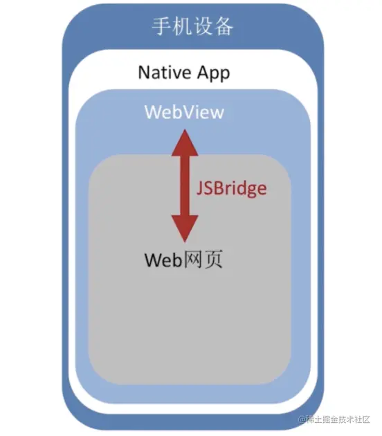 - 层次关系:手机设备=> Native App => WebView <=JSBridge=> Web网页