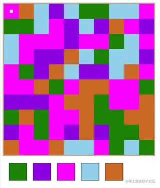 定义数组var blocks=[];保存面板中100个小方块的着色,第i行第j列小方块的着色保存在数组元素blocks[10*i+j]中。初始时,每个小方块的着色在选定的5种颜色中随机选择一种,一个简单的循环可完成。