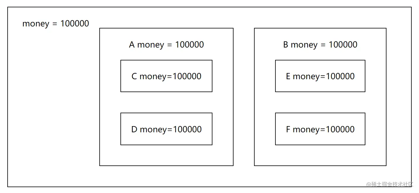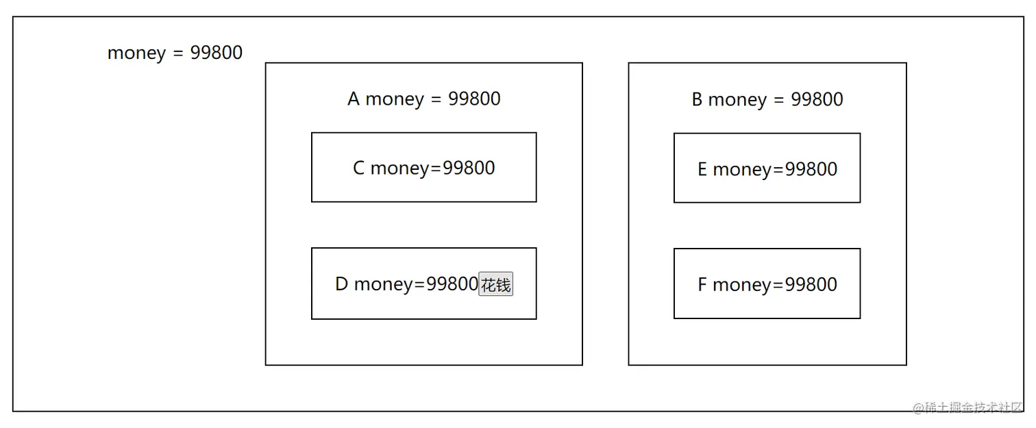 我们可以将money通过props的方式层层传递,最后形成以下图