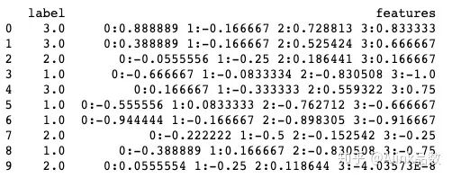 输出结果如下,最左边为打印显示的数据索引号,接下来是数据的标签列(列名自动命名为 label),然后是数据的特征数据列(列名自动命名为 features)。