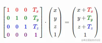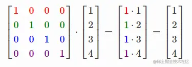 在OpenGL中,由于某些原因我们通常使用4×4的变换矩阵,其中最重要的原因就是大部分的向量都是4分量的.我们能想到的最简单的变换矩阵就是单位矩阵(Identity Matrix).单位矩阵是一个除了对角线以外都是0的N×N矩阵.在下式中可以看到,这种变换矩阵使一个向量完全不变: