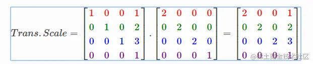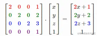 阵乘法是不遵守交换律的,这意味着它们的顺序很重要。当矩阵相乘时,在最右边的矩阵是第一个与向量相乘的,所以你应该从右向左读这个乘法。建议您在组合矩阵时,先进行缩放操作,然后是旋转,最后才是位移,否则它们会(消极地)互相影响。比如,如果你先位移再缩放,位移的向量也会同样被缩放(译注:比如向某方向移动2米,2米也许会被缩放成1米)!