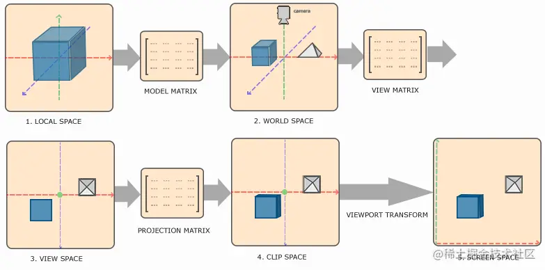 所有顶点转换为片段之前,顶点需要处于的不同的状态,将对象的坐标转换到几个过渡坐标系,对我们来说比较重要的总共有5个不同的坐标系统.