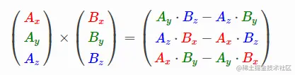 叉乘只在3D空间中有定义,它需要两个不平行向量作为输入,生成一个正交于两个输入向量的第三个向量,如果输入的两个向量也是正交的,那么叉乘之后将会产生3个互相正交的向量.下面的图片展示了3D空间中叉乘的样子: