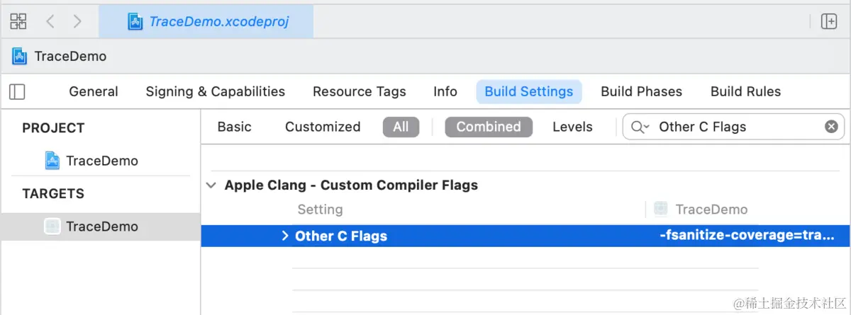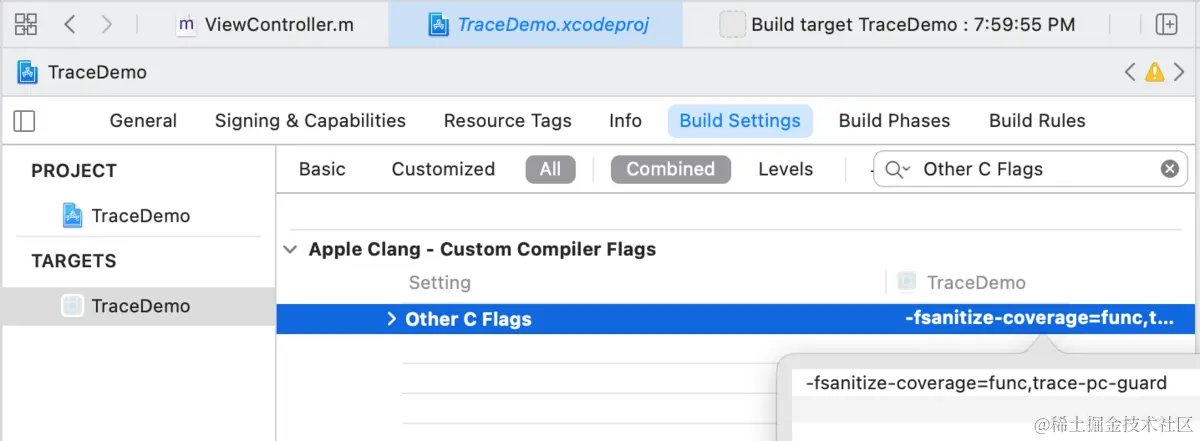 Build Setting -> Other C Flags中,将配置修改为-fsanitize-coverage=func,trace-pc-guard对其增加func参数