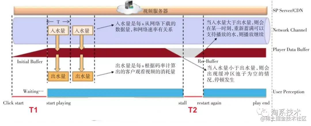 我们假设Initial Buffer(首帧)为100K(实际调整以真实情况为准),起播时间 T1 < 1s 记为秒开,停顿时间 T2 > 100ms 记为卡顿。