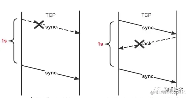 如图,TCP在握手时,由于尚未收到对端的ACK,无法计算路径RTT,因此,RFC定义了初始重传超时,当超过这个超时时间还未收到对端ACK,就重发sync报文。