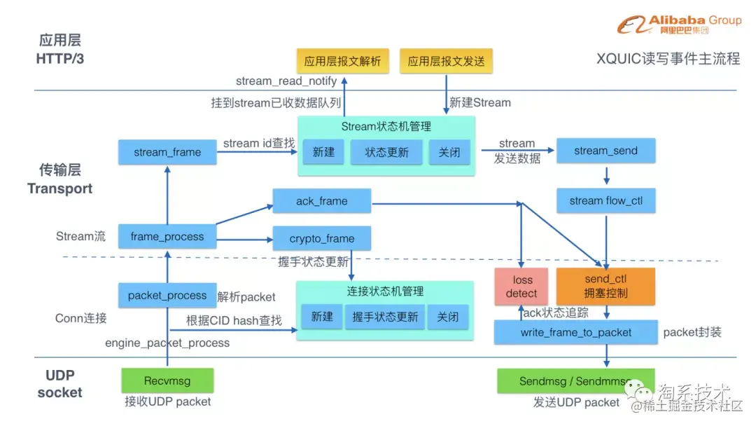 XQUIC传输层内部流程设计如下图,可以看到XQUIC内部的读写事件主流程。考虑到跨平台兼容性,UDP收发接口由外部实现并注册回调接口。XQUIC内部维护了每条连接的状态机、Stream状态机,在Stream级别实现可靠传输(这也是根本上解决TCP头部阻塞的关键),并通过读事件通知的方式将数据投递给应用层。传输层Stream与应用层HTTP/3的Request Stream有一一映射关系,通过这样的方式解决HTTP/2 over TCP的头部阻塞问题。