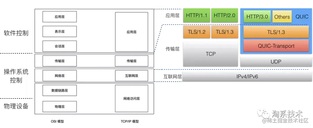 为了方便说明QUIC在网络通信协议栈中所处的位置及职能,我们简单回顾一下网络OSI模型(七层模型)和TCP/IP模型(四层模型)。从两套网络模型中可以看出,网络传输行为和策略主要由传输层来控制,而TCP作为过去30年最为流行和广泛使用的传输层协议,是由操作系统控制和实现的。