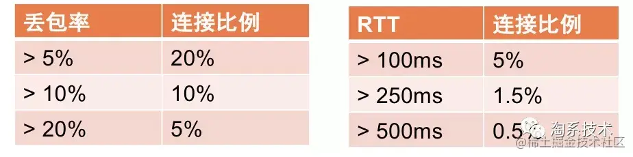 这是CDN某节点上统计的丢包率和RTT分布数据,可以看到,有5%的连接丢包率超过20%,0.5%的连接RTT超过500ms,如何优化网络较差用户的流媒体观看体验成为关键。
