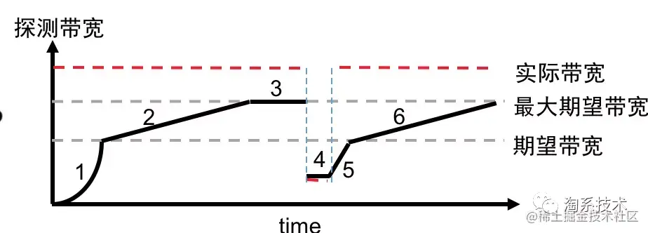 未达到期望带宽时采用较大的增益系数,较激进探测带宽。 达到期望带宽后采用较小的增益系数,较保守探测带宽。