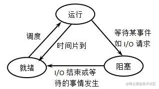 转为运行状态;而运行状态的进程,在分配给它的 CPU 时间片用完之后就会转为就绪状态,等待下一次调度。