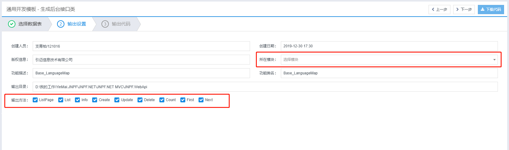 步骤2:所在模块和输出方法可以修改,其他都是自动读取的;