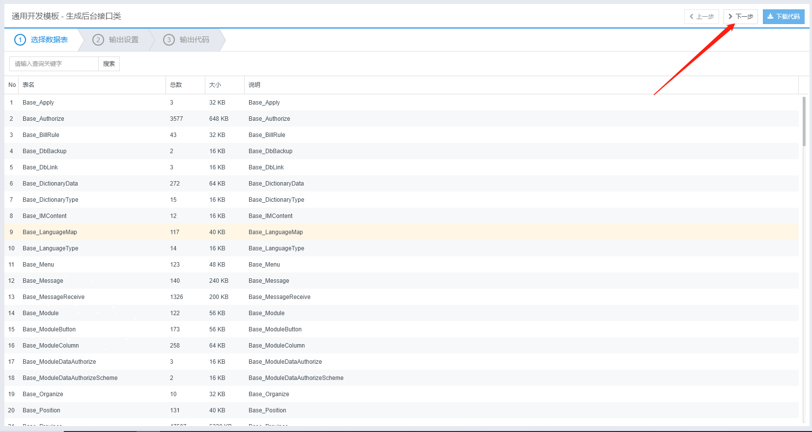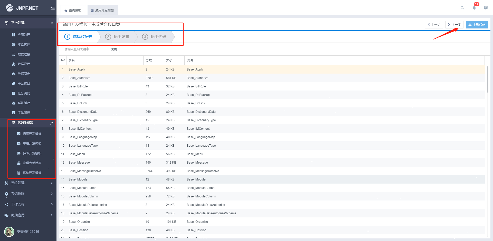 3、代码生成器:根据需求,选择对应的模块,根据操作点击下一步,最后复制即可使用;