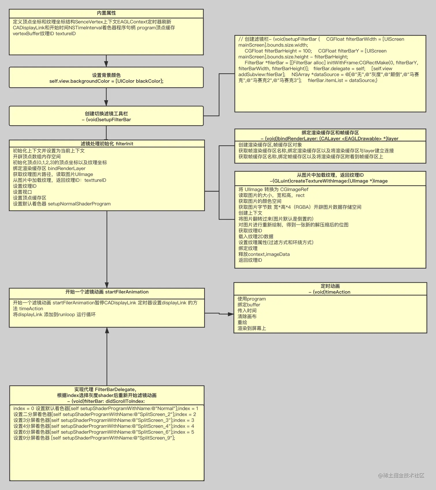 viewDidLoad函数(设置背景+创建切换滤镜效果工具栏) --> filterInit函数 (初始化上下文,准备顶点和纹理加载)-->着色器加载/编译 , program使用 --> startFilerAnimation